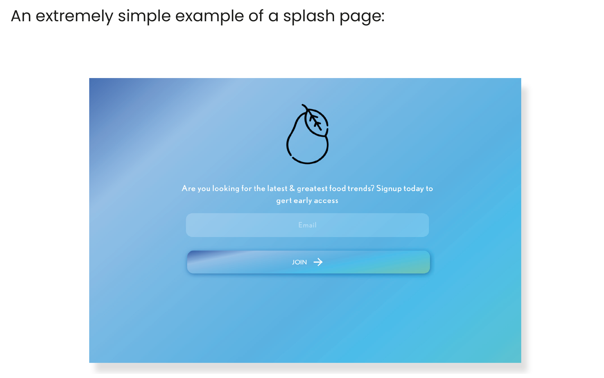 Splash Page: A splash screen is a graphical control element consisting of a window containing an image, a logo, and the current version of the software. A splash screen can appear while a game or program is launching. A splash page is an introduction page on a website.